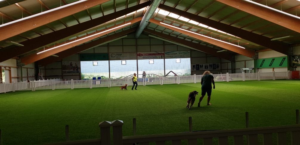 - Bodenbelag: hochwertiger, gelenkschonender Hundesportrasen (nur mit sauberen/Hallenschuhen zu betreten)